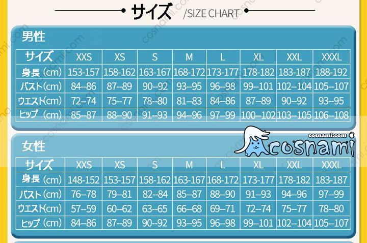 | 注意事項: | 1、本商品は上記の【セット内容】とおりです。道具、ウィッグと靴などが含まれておりませんのをご了承ください。 2、商品画像は明るさや光の反射、コンピュータースクリーン等で実物と多少の色合いが変わってみえることがございますがあしからずご了承ください。 3、計測に付きましては手測りとなりますので若干の誤差はご了承ください。 |